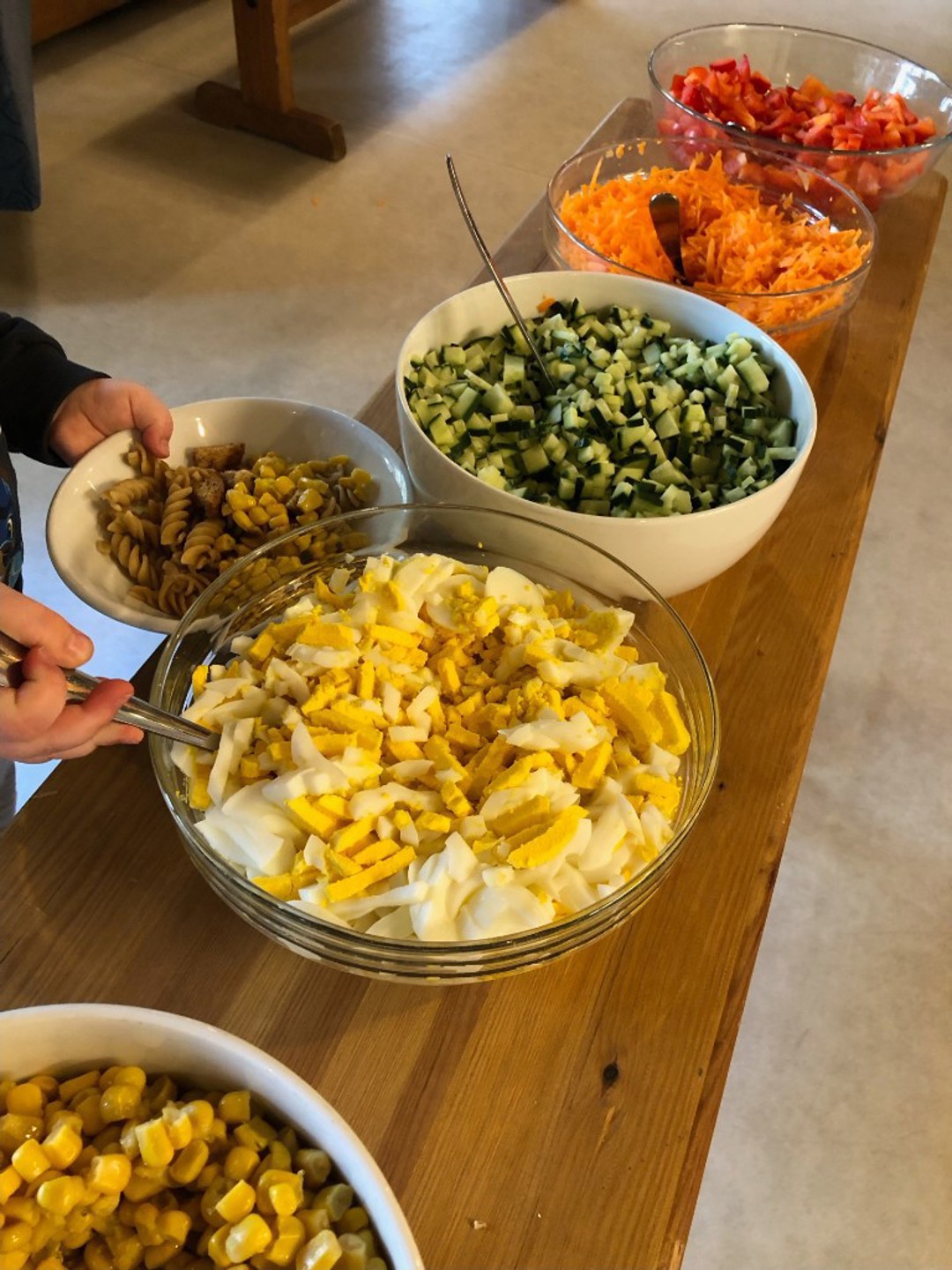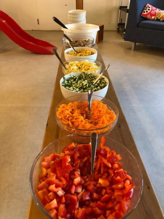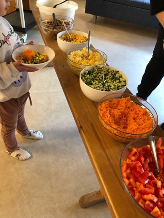 En dag i uka får små og store komme og forsyne seg av felles salatbar på kjøkken. Salatbaren er laget som en felles innsats fra barn og voksne og består av av paprika, agurk, mais, egg, pasta, krutonger, gulrøtter m.m. Vi ser at ungene koser seg veldig og spiser med god appetitt når de får forsyne seg selv. Rammeplanen for barnehager sier: Måltider og matlaging i barnehagen skal gi barna et grunnlag for å utvikle matglede og sunne helsevaner.